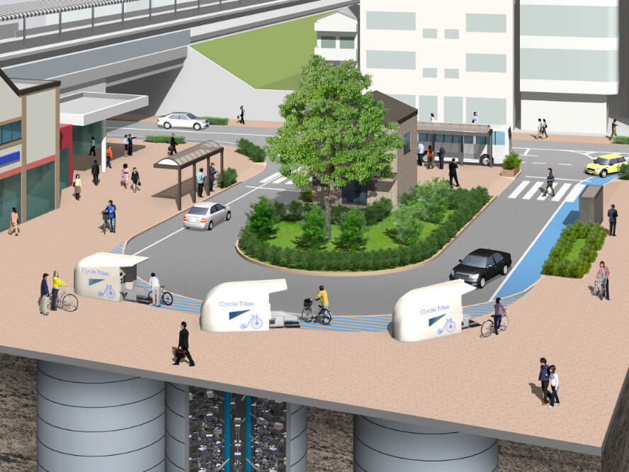 A: やはり景観に配慮した設備ということですかね。 当社は地下駐輪場の躯体の構築のみですが、完成形としては表向きは図にあるように自転車を入れるゲートがあるだけです。大容量の駐輪場が3基出来るので、違法駐輪がなくなれば駅前の景観はとても良くなると思いますよ。 完成したら、実際の景観や地元の人の反応を見に来たいと思います。