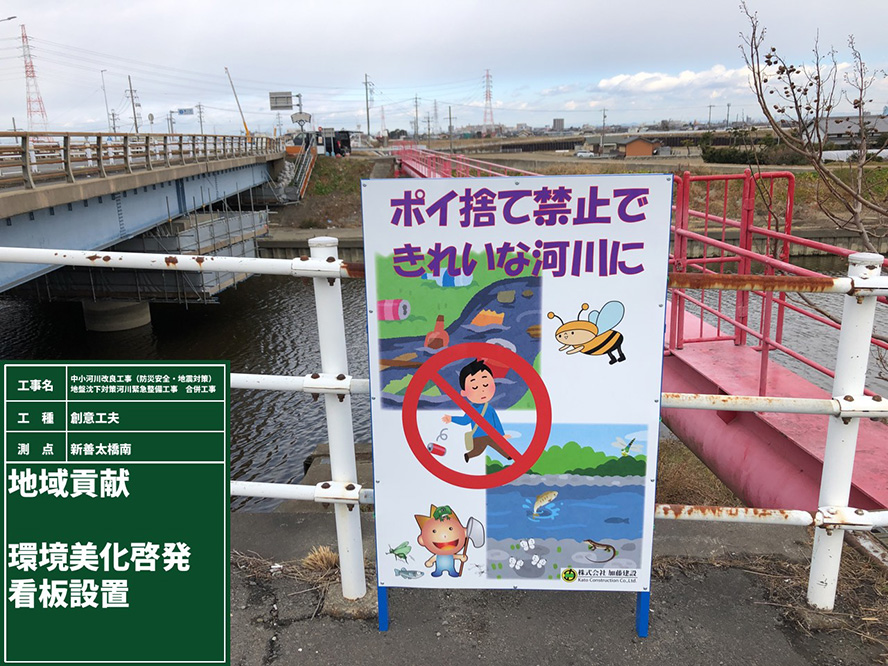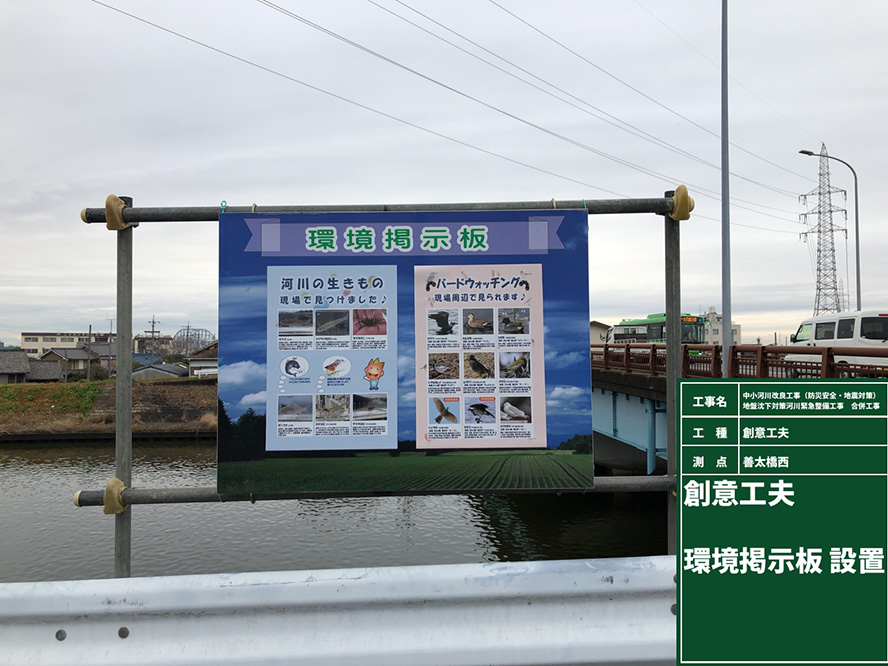 | 環境 | 環境提案・実施計画書、野鳥・水生生物調査、環境掲示板、ポイ捨て啓発看板、シルトフェンス |