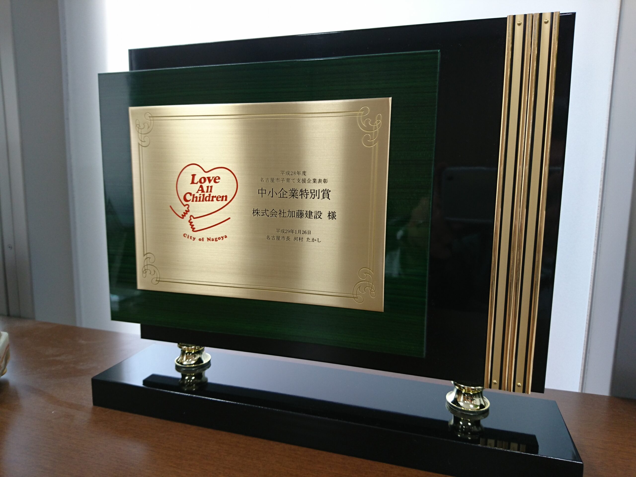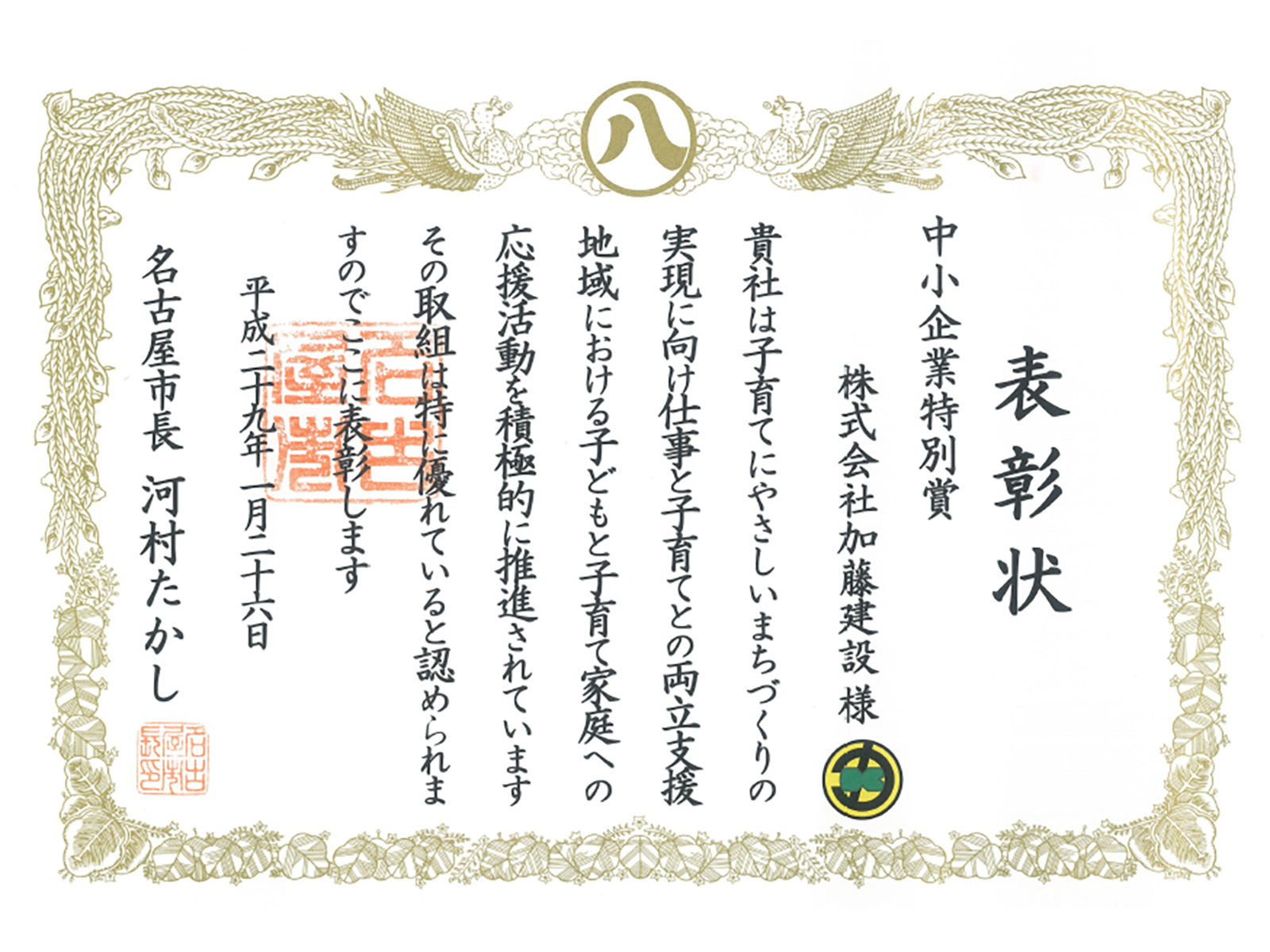 | 受賞名 | 名古屋市子育て支援企業 中小企業特別賞 |