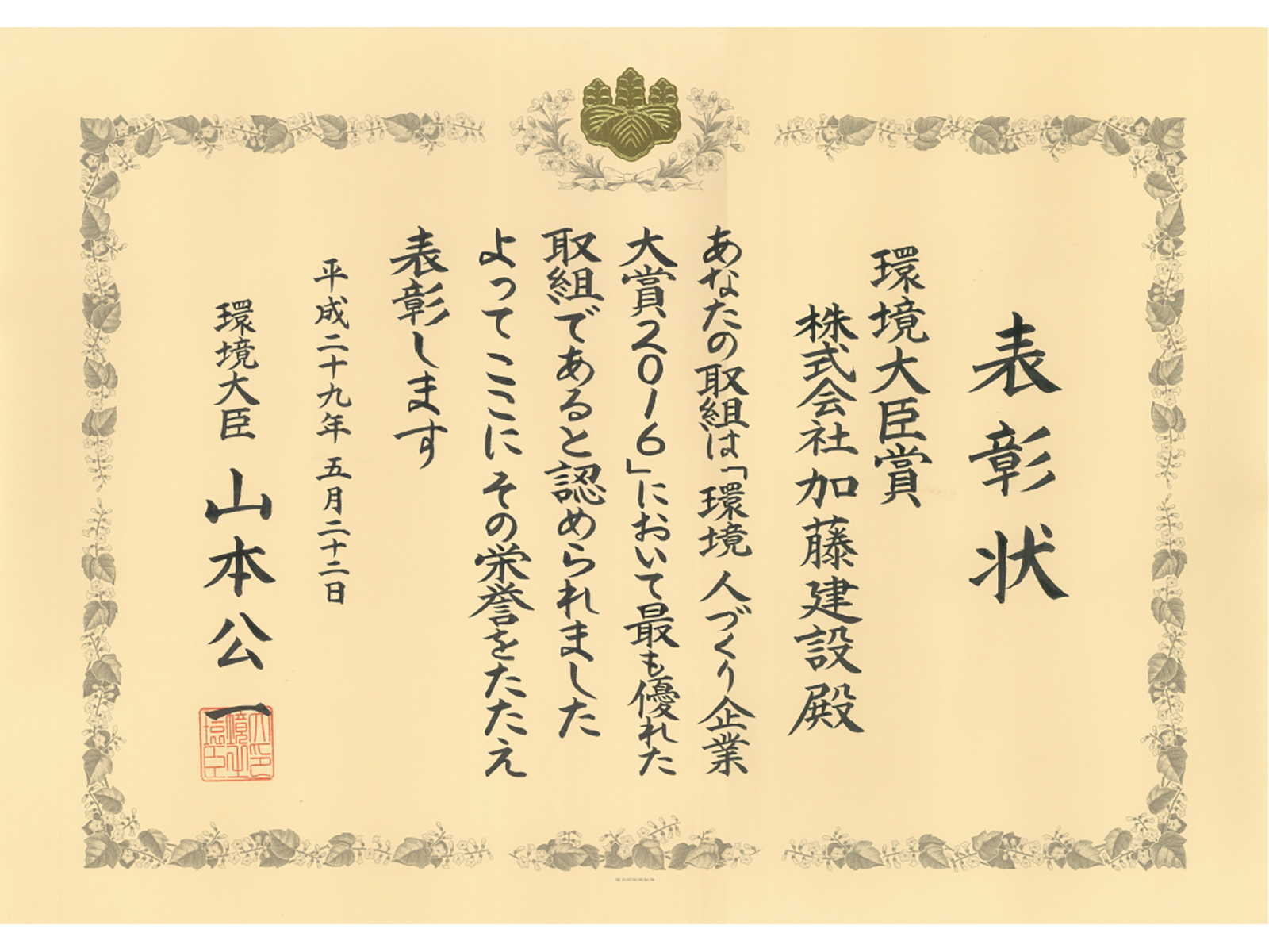 | 受賞名 | 環境 人づくり企業大賞2016 環境大臣賞 |
