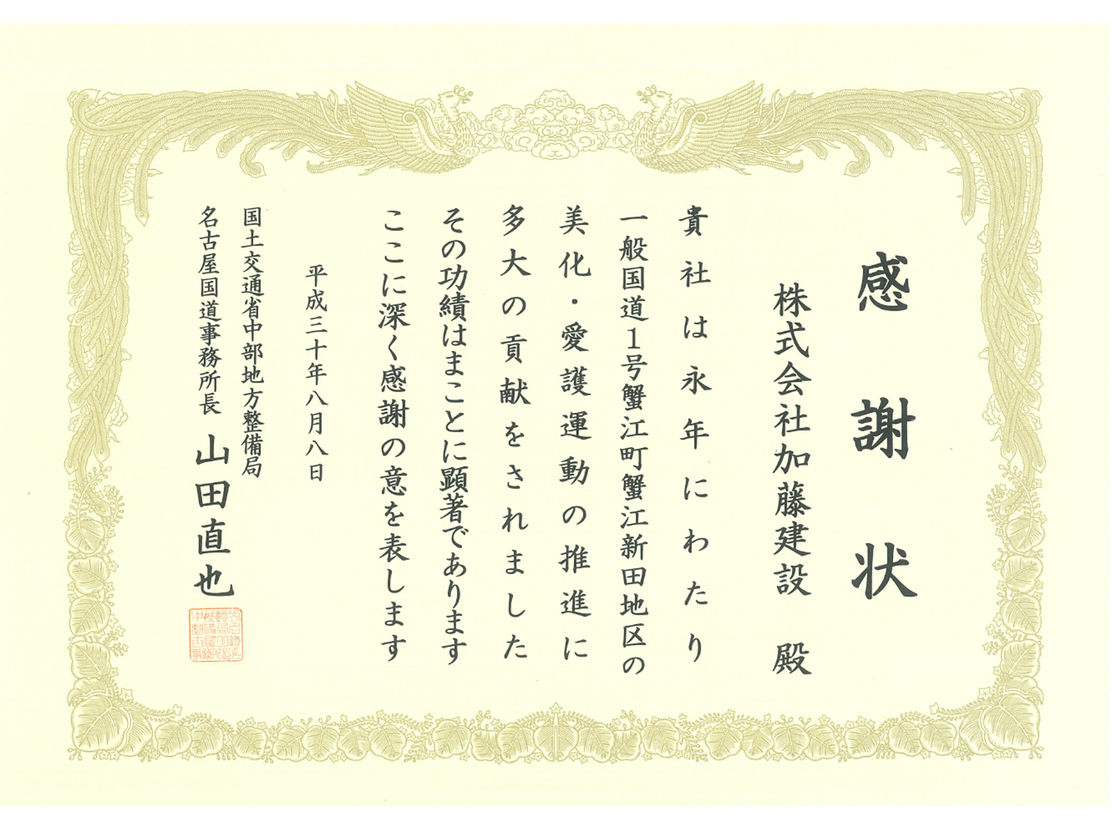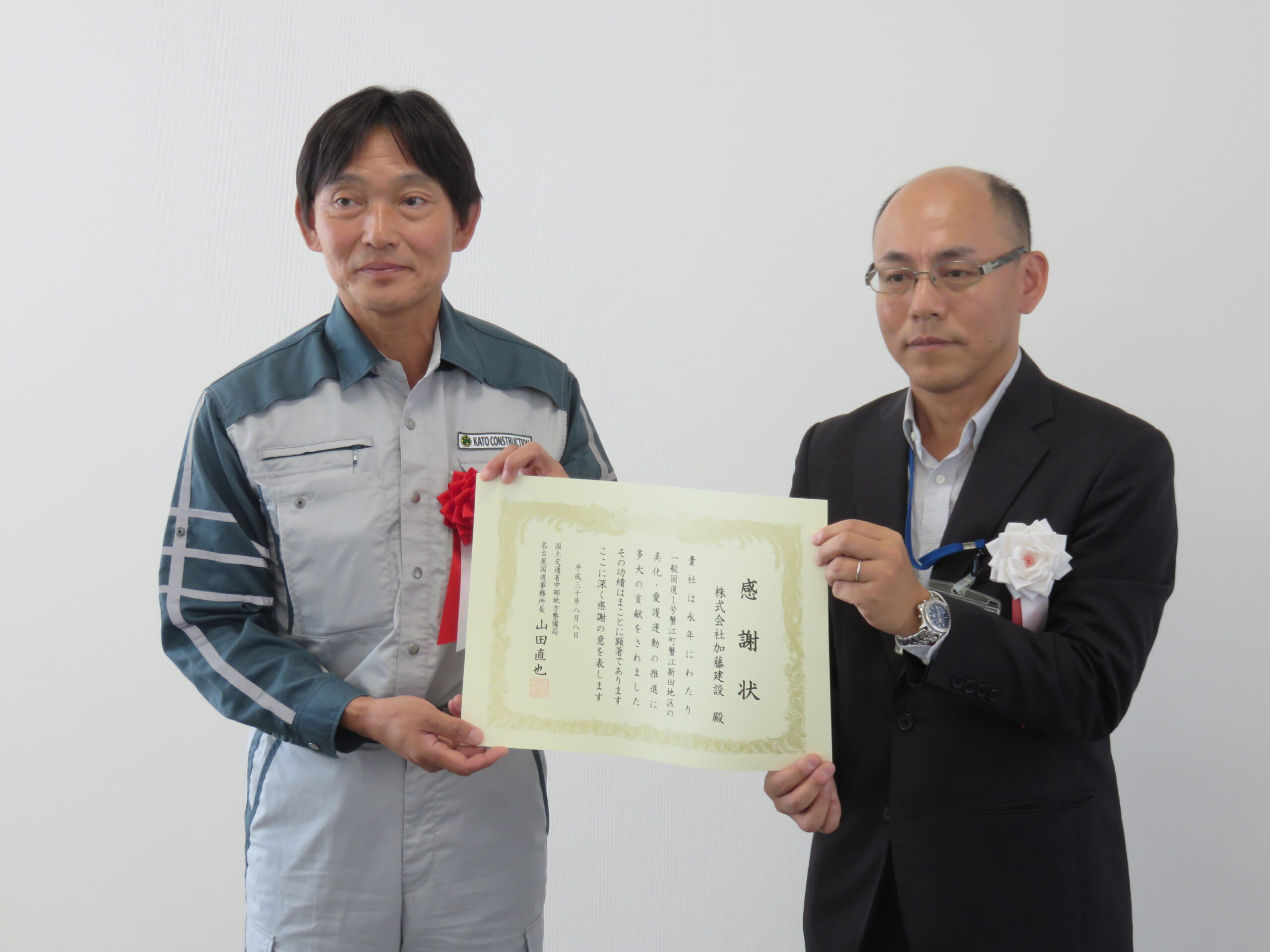 | リンク | ▼国土交通省 中部地方整備局 記者発表資料 https://www.cbr.mlit.go.jp/kisya/2018/07/0750.pdf ホームページ-花壇をつくろう! ▼カトケンブログ 本社前の花壇整備活動が表彰されました!! |